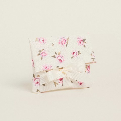 Μπομπονιέρα βάπτισης για κορίτσι εμπριμε πουγκί που διπλώνει και κλείνει με κορδέλα. Περιέχει πέντε κουφέτα Χατζηγιαννάκη. Διαστάσεις: 12x17εκ.