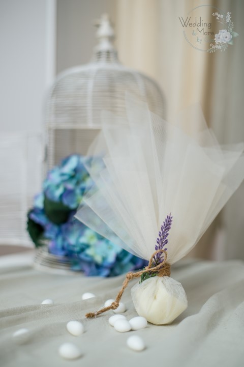 Μπομπονίερα με διπλό τούλι οργάντζας, επτά κουφέτα Χατζηγιαννάκη διακοσμημένη με λεβάντα. Διαστάσεις 45x40 σε λευκό και ιβουάρ χρώμα.