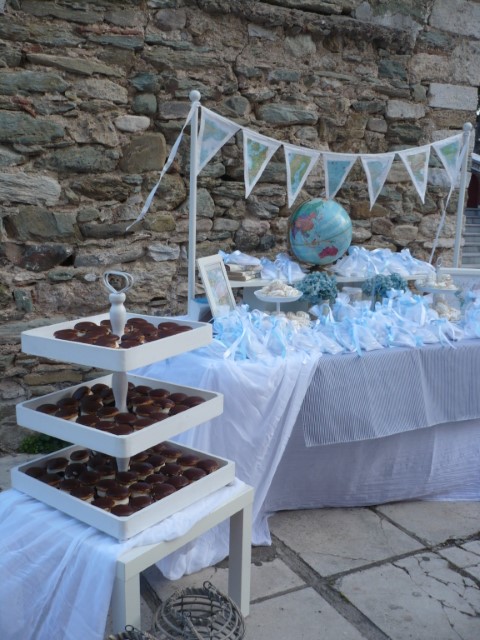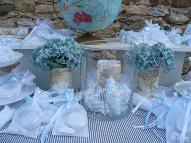Όμορφη βάπτιση για αγόρι με θέμα το ταξίδι σε retro διάθεση που θα σας κερδίσει. Κυριαρχούν οι αποχρώσεις του γαλάζιου και του λευκού με καφέ πινελιές, ιδιαίτερα διακοσμητικά αντικείμενα συνδυασμένα με το θέμα που σίγουρα θα σας ταξιδέψουν.