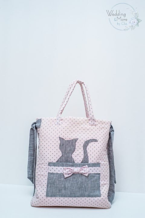 Χειροποίητη τσάντα βάπτισης άριστης ποιότητας από πικέ πουά ύφασμα σε αποχρώσεις του ροζ και του γκρι, με απλικαρισμένη γάτα στο κέντρο. Ιδανική για καθημερινή χρήση πέραν της βάπτισης.Συνδυάζεται με την αντίστοιχη λαμπάδα,λαδόπανο και μπομπονιέρα. Για αλλαγές στα χρώματα επικοινωνήστε με το κατάστημά μας.