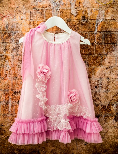 Φόρεμα από μεταξωτό τούλι, ντουμπλαρισμένο με ταφτά και οργάντζα, διακοσμημένο με βολάν πουά οργάντζας και λουλούδια μουσελίνας. Μοναδικός σχεδιασμός, ποιοτικά υλικά και άριστη ραφή.
