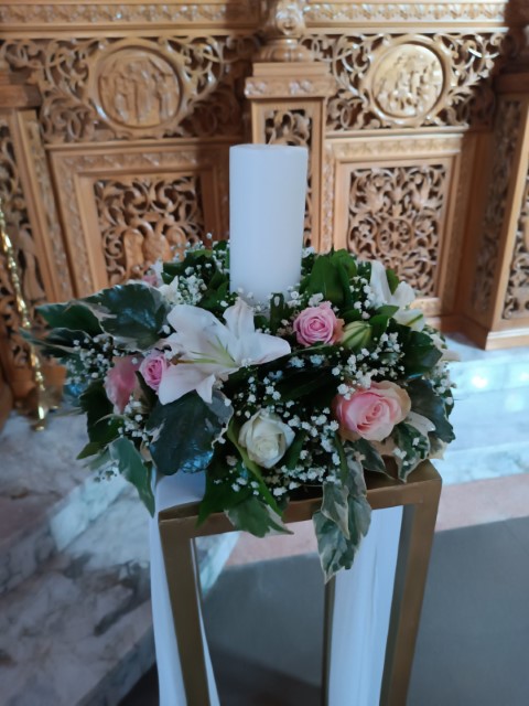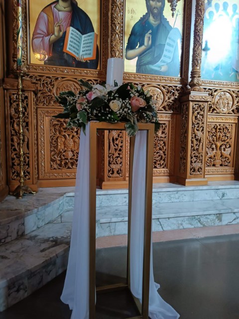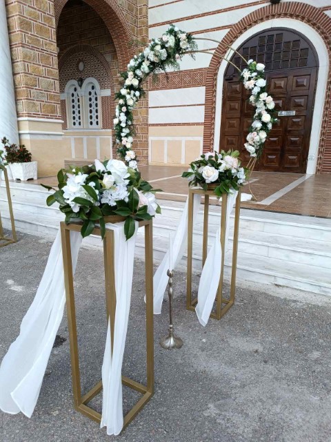 Ρομαντικός γάμος στο Πανόραμα Θεσσαλονίκης. Εντυπωσιακή αψίδα και μεταλλικά σταντ με συνθέσεις λουλουδιών στην είσοδο της εκκλησίας, τραπέζι υποδοχής που φιλοξένησε τα γλυκά και τις μπομπονιέρες με κεντρικό στοιχείο κυκλική αψίδα , διακοσμημένο με κρυστάλλινα κηροπήγια και πιατέλες και μοναδικές πινελιές που απογείωσαν το σκηνικό.