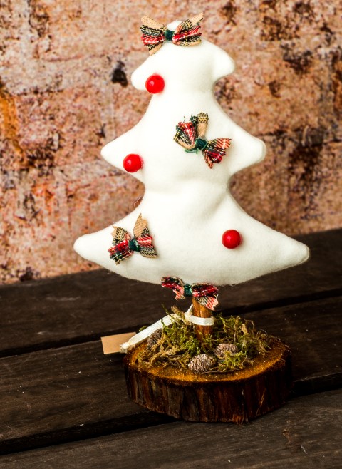 Χριστουγεννιάτικο διακοσμητικό δεντράκι, κατασκευασμένο από λευκό μάλλινο ύφασμα, επάνω σε κορμό. Διαστάσεις: ύψος 20 x φάρδος 13 εκ. Βάση διάμ. 9εκ.