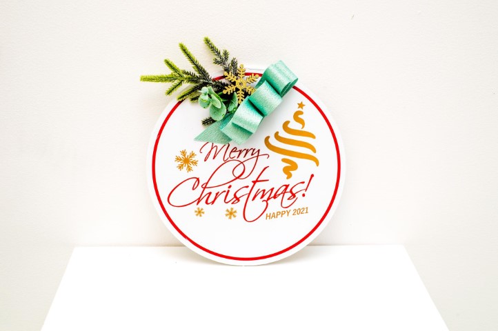 Ξύλινη διακοσμητική πινακίδα με Χριστουγεννιάτικο μήνυμα, διακοσμημένη με κλαδιά έλατου, χρυσή χιονονιφάδα και εντυπωσιακό βεραμάν φιόγκο. Διάμετρος 20εκ.