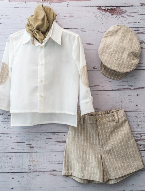 Βαπτιστικό σετ που αποτελείται από βαμβακερή πουκαμίσα με λεπτομέρειες από λινό ύφασμα, φουλάρι, ασορτί ριγέ βερμούδα και τραγιάσκα.