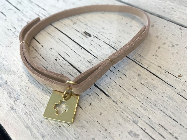 Μαρτυρικό βραχιόλι βάπτισης με μπεζ suede δέρμα και διάτρητο χρυσό σταυρό. Η τιμή αναφέρεται στη συσκευασία των 50 τεμαχίων.