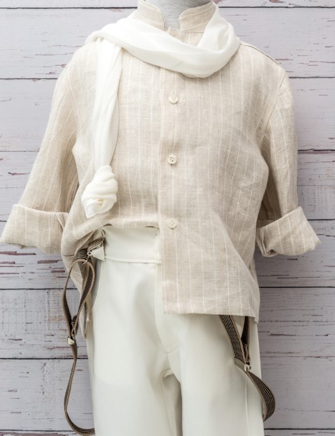 Μοντέρνο βαπτιστικό σετ για αγόρι που αποτελείται από ριγέ λινή πουκαμίσα με μάο γιακά, βαμβακερό παντελόνι σε ίσια γραμμή, τιράντες, φουλάρι και ψάθινο καπέλο.