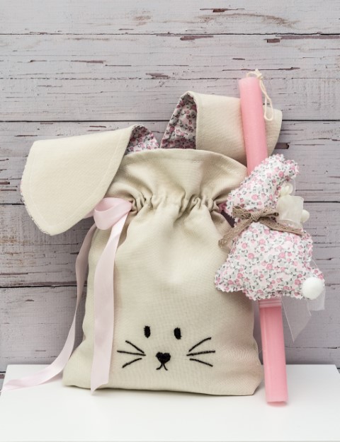 Πασχαλινή λαμπάδα για κορίτσι,εμπριμέ λαγουδάκι με ασορτί πουγκί.