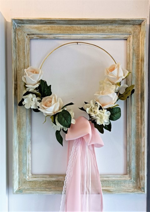 Χρυσό μεταλλικό στεφάνι διακοσμημένο με ιβουάρ τριαντάφυλλα και ροζ κρεπ ύφασμα. Διάμετρος 30εκ.