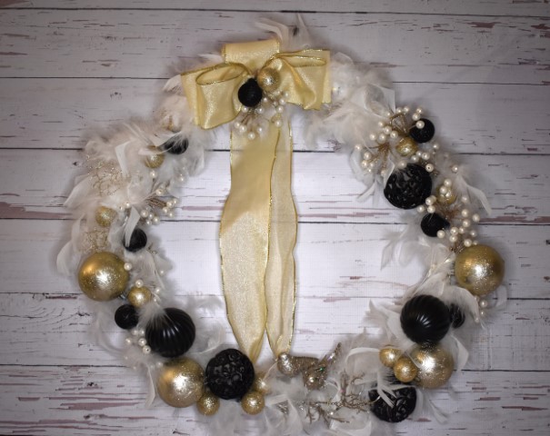 Χριστουγεννιάτικο στεφάνι διακοσμημένο με πούπουλα, μπάλες, πέρλες και εντυπωσιακό φιόγκο. Διάμετρος 44εκ.