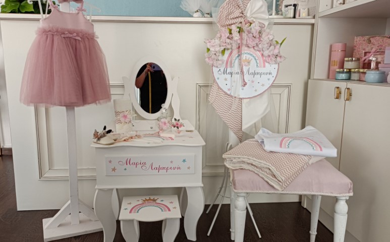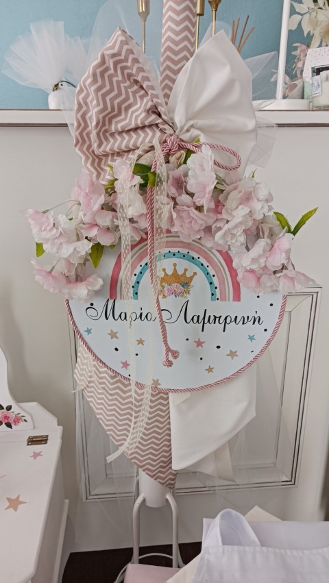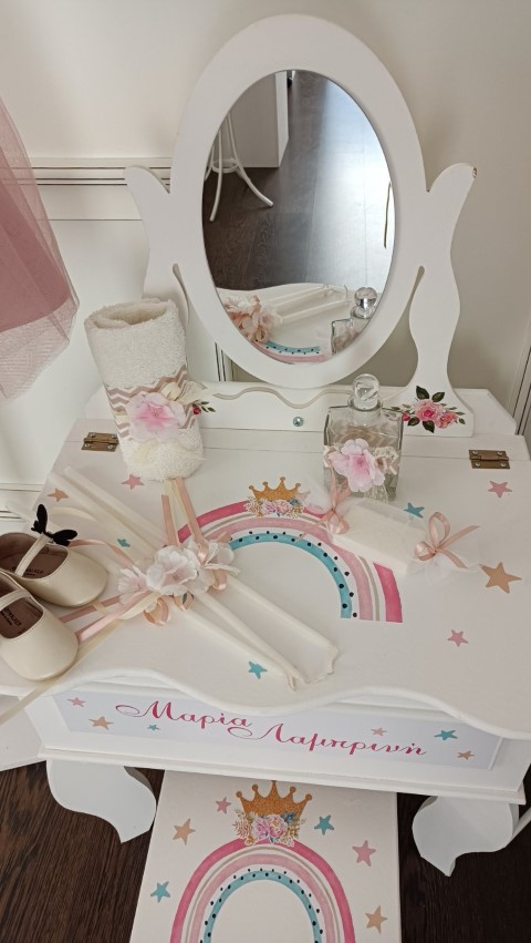 Σετ βάπτισης για κορίτσι με θέμα ουράνιο τόξο. Το σετ αποτελείται από μπουντουάρ, λαμπάδα, λαδόπανα και λαδοσέτ. Μπορεί να συνδυαστεί με την ασορτί μπομπόνιερα ή ακόμα και με τον στολισμό της εκκλησίας, για ένα ολοκληρωμένο και ξεχωριστό αποτέλεσμα. Υπάρχει και η δυνατότητα επιλογής μεμονωμένων κομματιών.