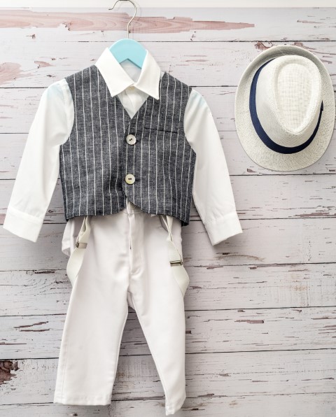 Βαπτιστικό σετ για αγόρι που αποτελείται από μεταξωτό ριγέ γιλέκο συνδυασμένο με παντελόνι καπαρντίνα και λευκό βαμβακερό πουκάμισο. Στο σετ περιλαμβάνεται λευκό ψάθινο καπέλο και τιράντες.