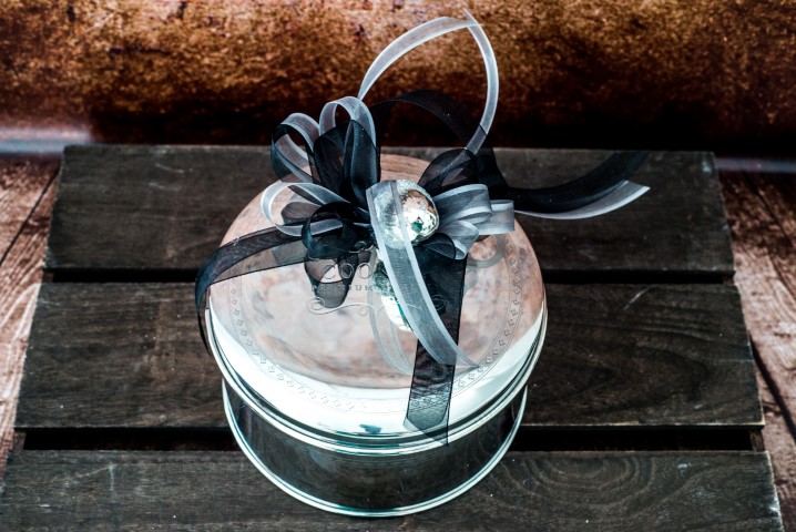 Μεταλλικό κουτί cookies διακοσμημένο με κορδέλες και ασημί κουκουνάρι. Μία ξεχωριστή πρόταση για προσφέρετε στους αγαπημένους σας τα σπιτικά κουλουράκια σας. Διαστάσεις: Φ17 x 10εκ.