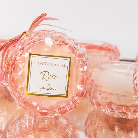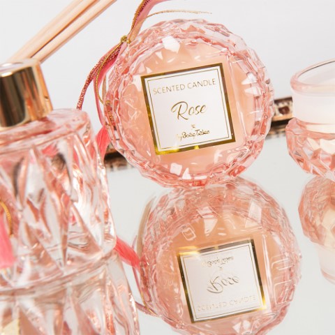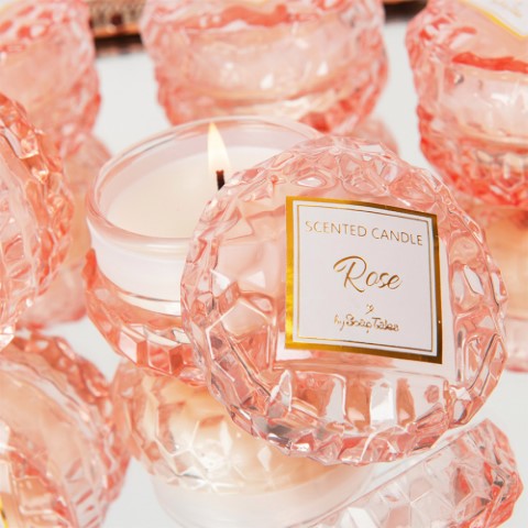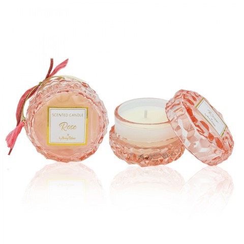 Μπομπονιέρα γάμου, κερί με άρωμα Rose, σε απαλό ροζ γυάλινο βαζάκι 50γρ. Διάμετρος 7εκ.x 5εκ. ύψος. Η μπομπονιέρα είναι δεμένη με πέντε κουφέτα Χατζηγιαννάκη.