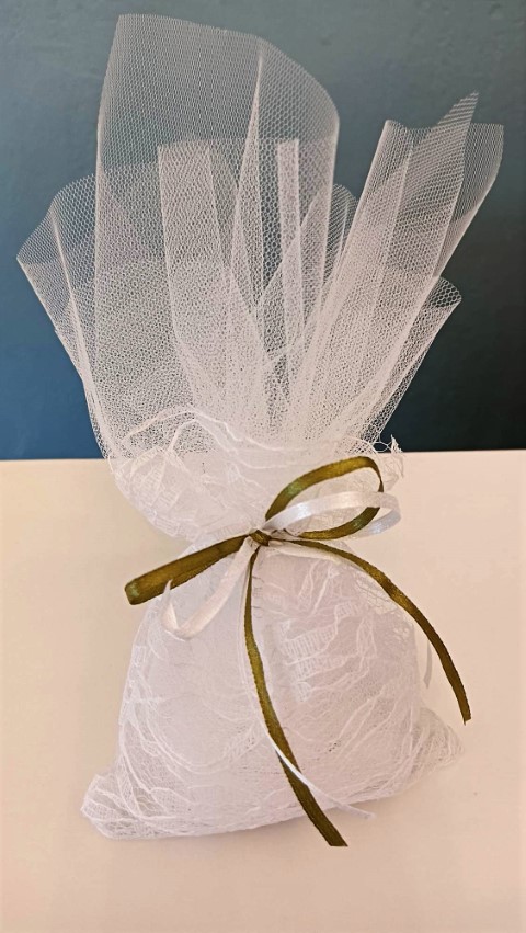 Μπομπονιέρα γάμου πουγκί δαντέλας με τούλινο ψηλότερο μαντήλι, δεμένη με λεπτές σατέν κορδέλες. Περιλαμβάνονται πέντε κουφέτα Χατζηγιαννάκη. Διαστάσεις: Πουγκί: 15x11εκ. Τούλι: 40x40εκ. Μπορούν να γίνουν αλλαγές στο χρώμα κατόπιν συνεννοήσεως με το κατάστημά μας.