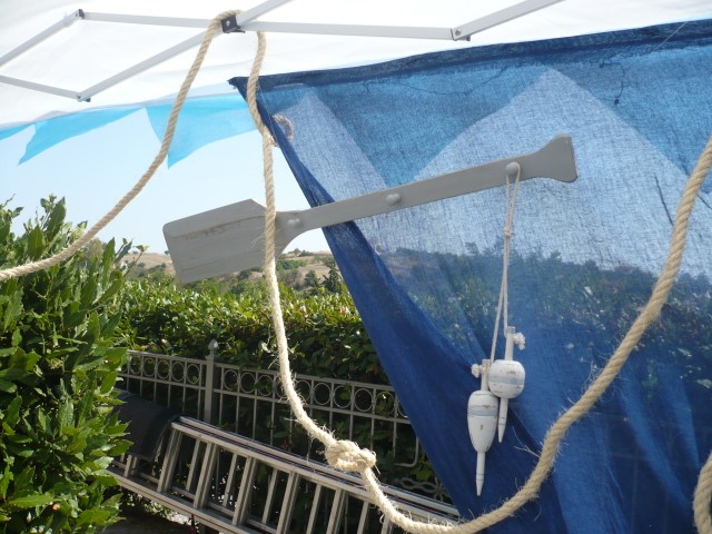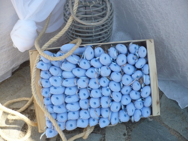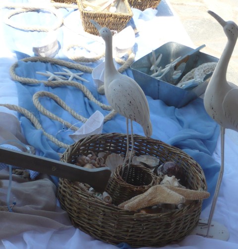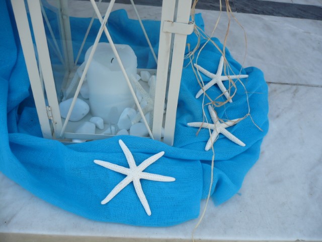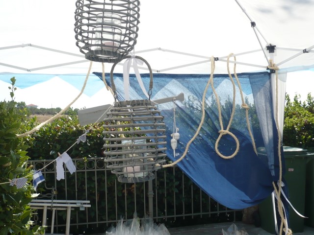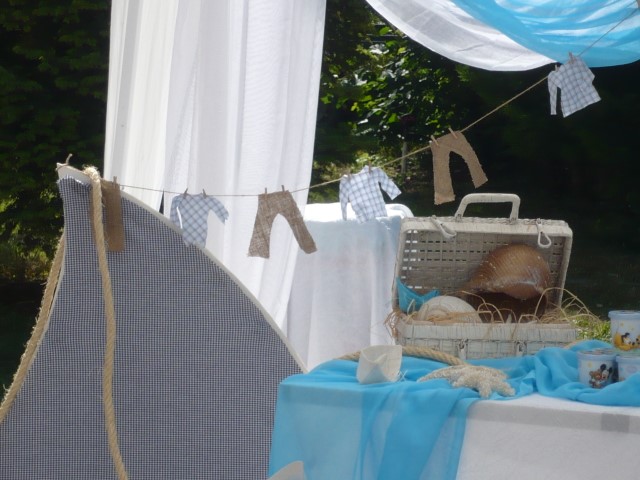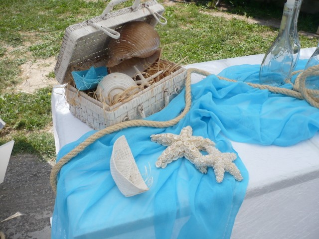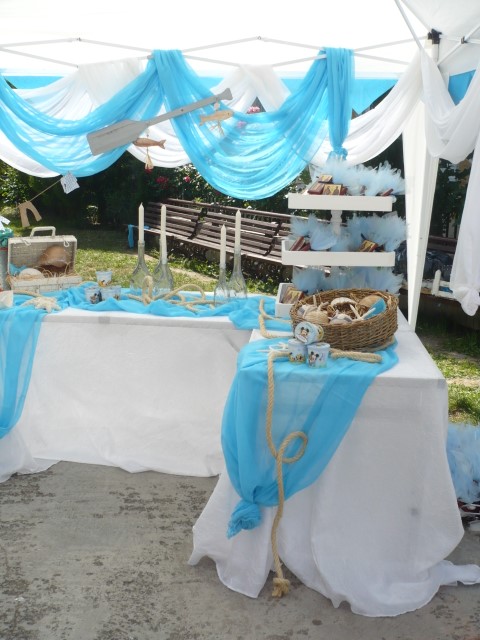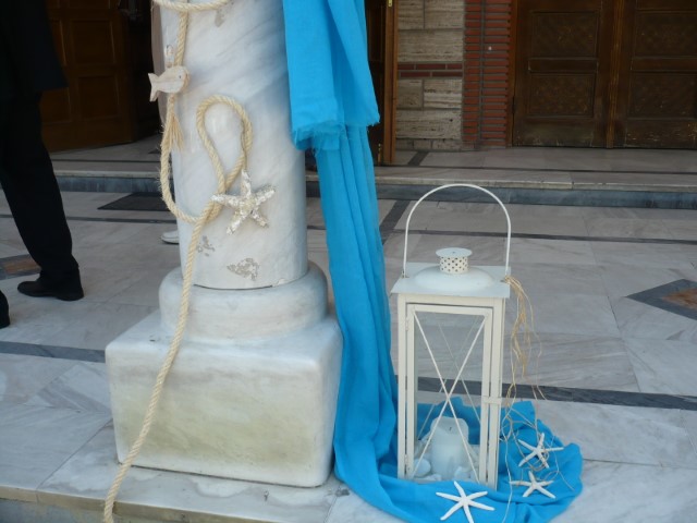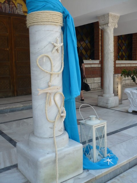 Στολισμός βάπτισης με θαλασσινό θέμα σε χρώματα τιρκουαζ, μπλε σκούρο και λευκό. Οι κολώνες στην είσοδο της εκλησσίας είναι διακοσμημένες με σχοινί, γάζες, κοχύλια και φανάρια δημιουργώντας ένα ιδιαίτερο αποτέλεσμα ενώ τα ξύλινα καράβια στο κιόσκι δημιουργούν ένα πρωτότυπο σκηνικό. Μία αγαπημένη και διαχρονική πρόταση που εντυπωσιάζει.