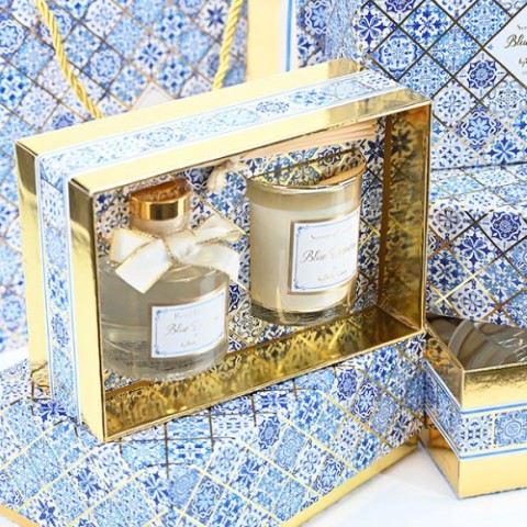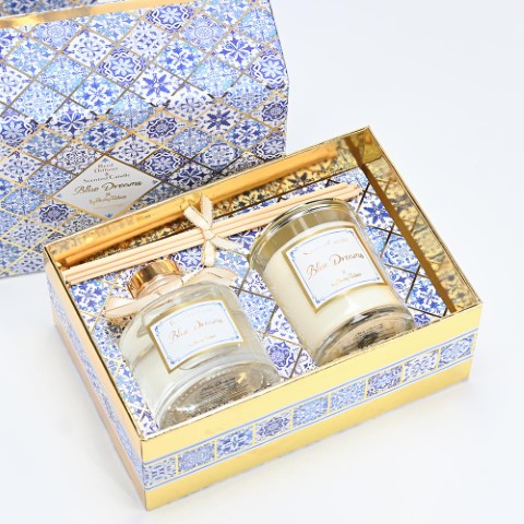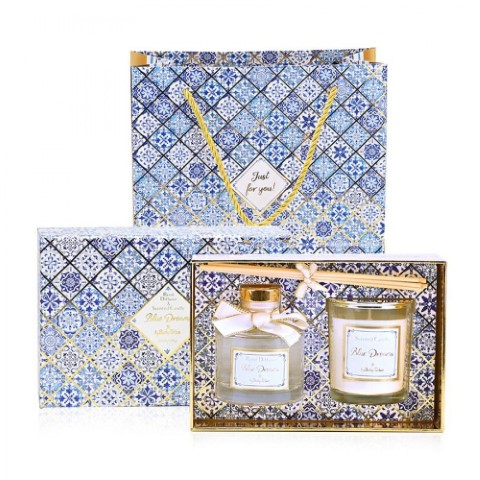 Σετ δώρου αρωματικό κερί 100gr. και αρωματικό χώρου 100ml. με υπέροχο άρωμα blue dreams, μαζί με ίδια τσάντα δώρου. Διστάσεις κουτιού: 19x13x8εκ. Διαστάσεις τσάντας: 23x22x9εκ.