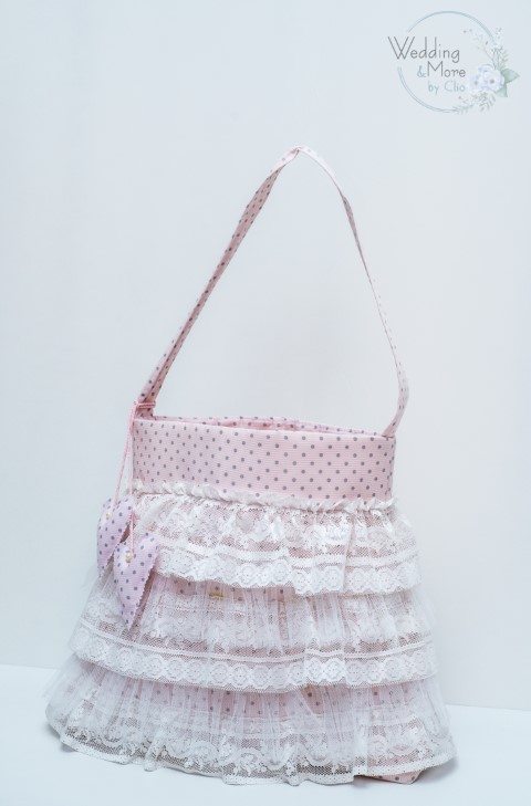 Χειροποίητη τσάντα βάπτισης για κορίτσι από πικέ ύφασμα, με βολάν βαμβακερής δαντέλας και διακοσμητικές καρδούλες.