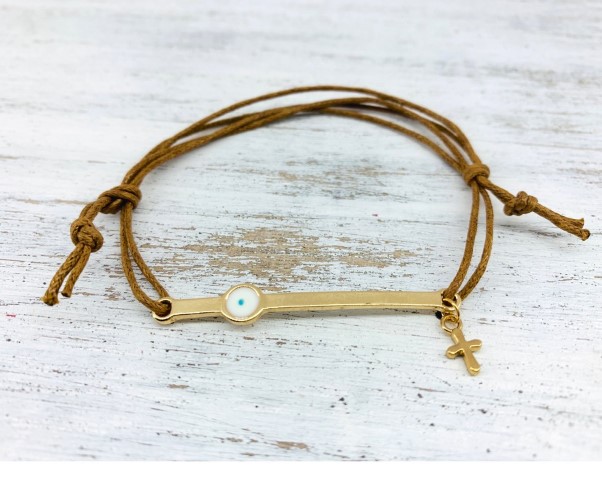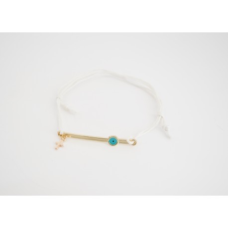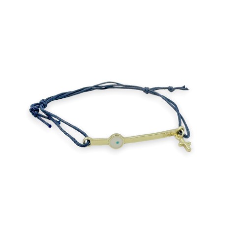 Μαρτυρικό βάπτισης σε λευκό κερωμένο κορδόνι, με χρυσή μπάρα, σιελ μάτι, και σταυρουδάκι. Διαθέσιμο σε μπλε σκούρο και καφέ χρώμα. Συσκευασία των 50 τμχ.