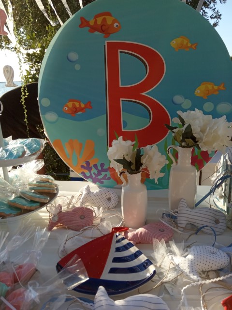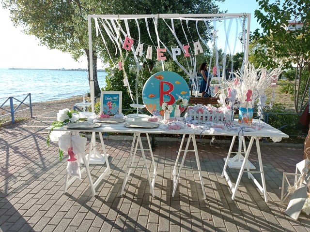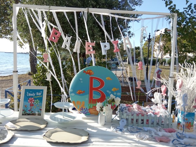 Βάπτιση με θαλασσινό θέμα για τη μικρή Βαλέρια, που πραγματοποιήθηκε σε παρεκκλήσι με φόντο την θάλασσα. Αρμονικά συνδιασμένη η διακόσμηση με το τοπίο, με ψάθινα καπέλα, φανάρια, κοχύλια, βότσαλα σε αποχρώσεις του γαλάζιου, κόκκινου, μπλε, μπεζ και λευκού, που μας ταξιδεύουν σε ένα μοναδικό καλοκαιρινό όνειρο. Χειροποίητες μπομπονιέρες και διακοσμητικά από ύφασμα, γλυκά και ζαχαρωτά σε ναυτικά σχήματα, όλα σχεδιασμένα στη λεπτομέρεια για ένα ολοκληρωμένο αποτέλεσμεμα.