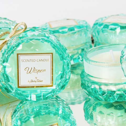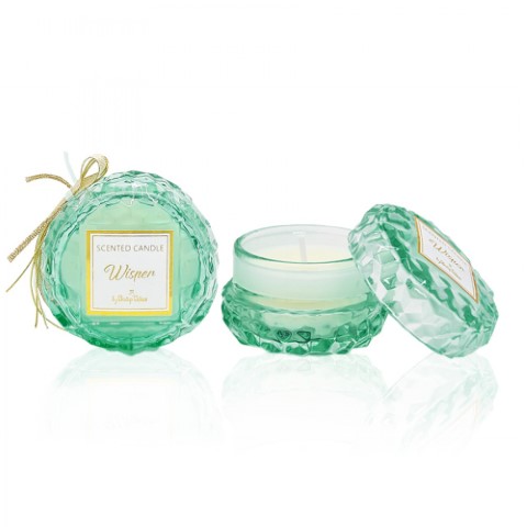 Μπομπονιέρα αρωματικό κερί με άρωμα wisper σε βεραμάν γυάλινο βαζάκι 50γρ. Η μπομπονιέρα είναι δεμένη με πέντε κουφέτα Χατζηγιαννάκη. Διαστάσεις: διάμ. 7εκ.x 5εκ. ύψος