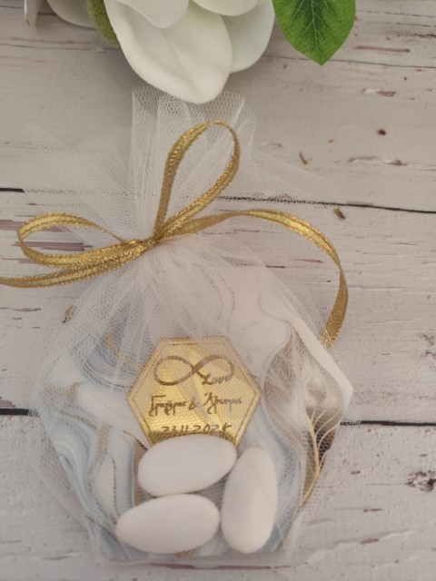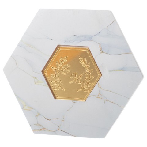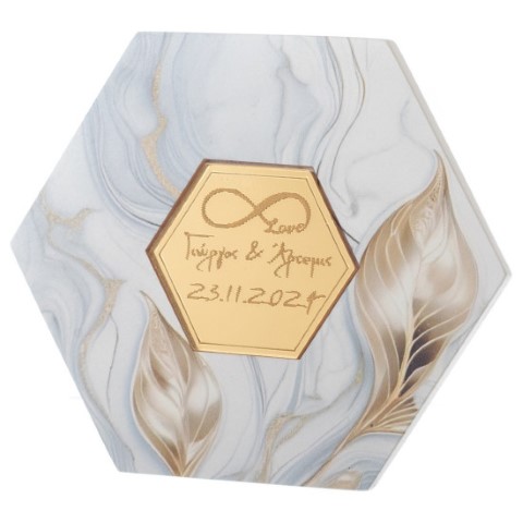 Μπομπονιέρα κεραμικό εξάγωνο σουβέρ με plexiglass στο κέντρο και χαραγμένα μονογράμματα. Διαστάσεις: 10x10 εκ.