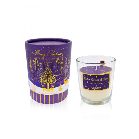 Κερί χριστουγεννιάτικο μωβ με άρωμα winder berries and spices, διάσταση κουτιού 10 x 8 εκ. ύψος. Βάρος κεριού 135 γρ.
