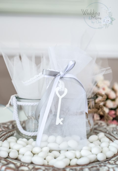 Μπομπονιέρα γάμου από τούλινο πουγκί διαστάσεων 20x11εκ. διακοσμημένη με ξύλινο κλειδί.Περιέχει επτά κουφέτα Χατζηγιαννάκη.