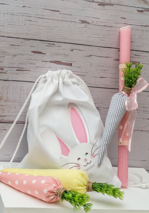 Σακίδιο πλάτης με τύπωμα κουνελάκι. Περιλαμβάνει λαμπάδα και διακοσμητικά καρότα.
