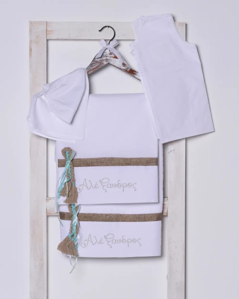 Σετ λαδόπανα βάπτισης για αγόρι βαμβακερά, με κεντημένο το όνομα του παιδιού στην φάσα. Το σετ περιλαμβάνει πετσέτα, σεντόνι, εσώρουχα και καπελάκι. Συνδυάζεται με την αντίστοιχη τσάντα, λαμπάδα και μπομπονιέρα. Για αλλαγές στα χρώματα επικοινωνήστε με το κατάστημά μας.