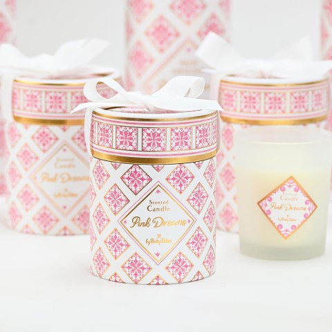 Μπομπονιέρα κερί pink dreams σε όμορφη συσκευασία. Η μπομπονιέρα είναι δεμένη με πέντε κουφέτα Χατζηγιαννάκη. Διαστάσεις: ύψος 9 εκ.x διάμετρο 7 εκ.