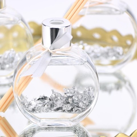 Μπομπονιέρα αρωματικό χώρου με ασημένια φύλλα και άρωμα Lily and Lotus 60ml. Δεμένη με πέντε κουφέτα Χατζηγιαννάκη.
