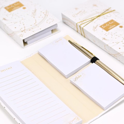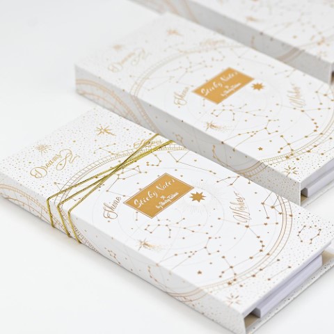 Πρωτότυπη μπομπονιέρα σημειωματάριο, με θέμα άστρα και πλανήτες, που συνδυάζει την λειτουργικότητα με την κομψότητα. Περιλαμβάνει sticky notes και αυτοκόλλητα post-it, χρυσό στυλό και πέντε κουφέτα Χατζηγιαννάκη. Διαστάσεις: 17x8x2 εκ.