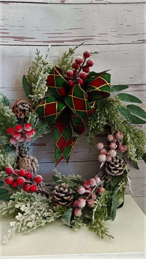 Στεφάνι χιονισμένο με berries, κλαδιά ελάτου, κουκουνάρια και χριστουγεννιάτικη κορδέλα. Διάμετρος 35εκ.