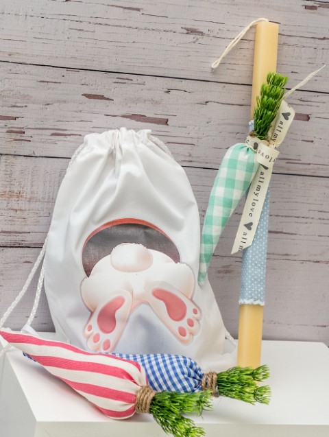 Σακίδιο πλάτης με πασχαλινή παράσταση. Περιλαμβάνει λαμπάδα και διακοσμητικά καρότα.
