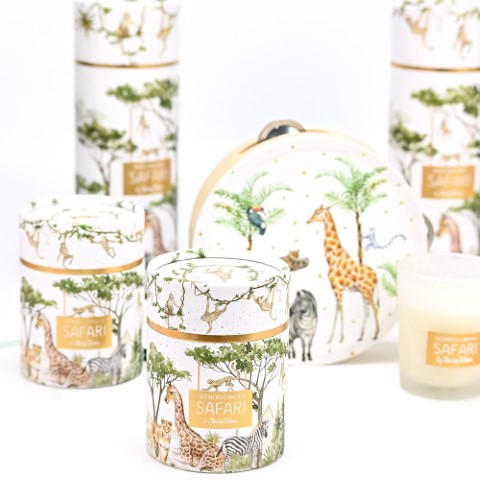 Μπομπονιέρα αρωματικό κερί με θέμα safari και άρωμα baby musk. Δεμένη με πέντε κουφέτα. Διάμετρος κουτιού 7x9,5εκ. Διάσταση κεριού 5,5x6,8εκ. 60 γρ. Ελάχιστη παραγγελία 40 τεμάχια.