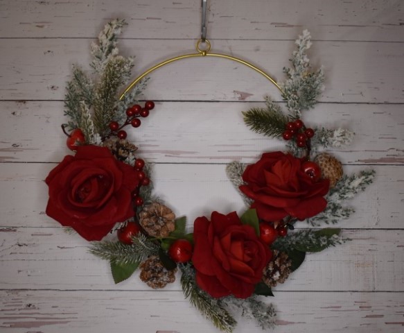 Μεταλλικό στεφάνι διακοσμημένο με κόκκινα τριαντάφυλλα, κουκουνάρια και κλαδάκια ελάτου. Διάμετρος 33εκ.