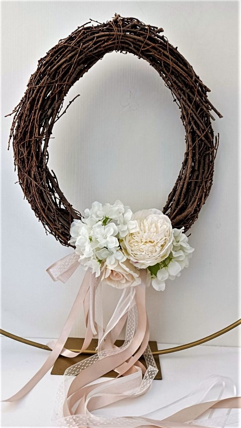 Χειροποίητο στεφάνι λυγαριάς σε σχήμα οβάλ, διακοσμημένο με παιώνιες, ορτανσίες και μακριές κορδέλες. Ένα ιδιαίτερο δώρο που θα μείνει αξέχαστο στους αγαπημένους σας. Μάκρος 45εκ.