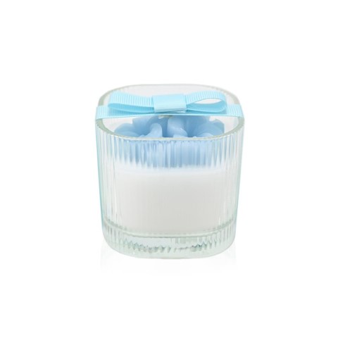 Μπομπονιέρα αρωματικό κερί σε κομψό γυάλινο βαζάκι, διακοσμημένο με ανάγλυφο κερί λουλούδι στο επάνω μέρος, Η μπομπονιέρα βγαίνει σε τρία χρώματα και περιλαμβάνει πέντε κουφέτα. Διαστάσεις: 7x7x6,5εκ. 120γρ