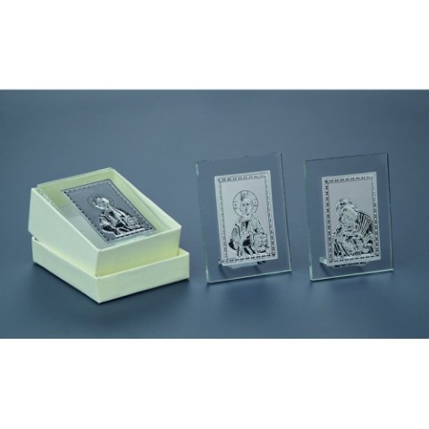 Μπομπονιέρα βάπτισης γυάλινη εικόνα με την Παναγία και τον Χριστό. Στην τιμή περιλαμβάνεται το κουτάκι και πέντε κουφέτα Χατζηγιαννάκη. Διαστάσεις εικόνας: 6x8 εκ.