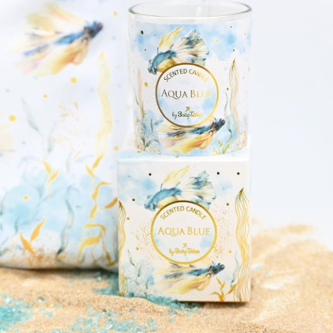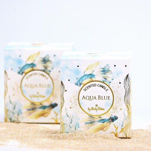 Μπομπονιέρα αρωματικό κερί 130γρ. aqua blue, δεμένη με πέντε κουφέτα. Διάσταση κουτιού 7,3 x 7,3 x 8,5εκ. Διάσταση κεριού 7 x 6,5 x 8εκ.