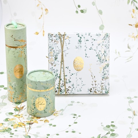 Μπομπονιέρα κερί Eden με άρωμα κέδρος και άγριο σύκο, δεμένη με πέντε κουφέτα. Διάμετρος κουτιού: 7Χ9 εκ. Διάσταση κεριού: 5,5x6,8 εκ.