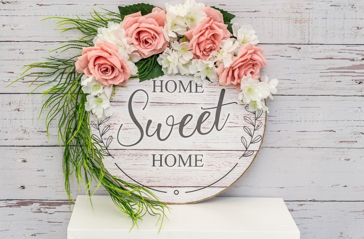Ταμπέλα home sweet home σε λευκό χρώμα με ροζ τριαντάφυλλα και λευκές ορτανσίες.Μία πρωτότυπη πρόταση για να διακοσμήσετε την εξώπορτα ή το τζάκι σας. Διάμετρος 30εκ.
