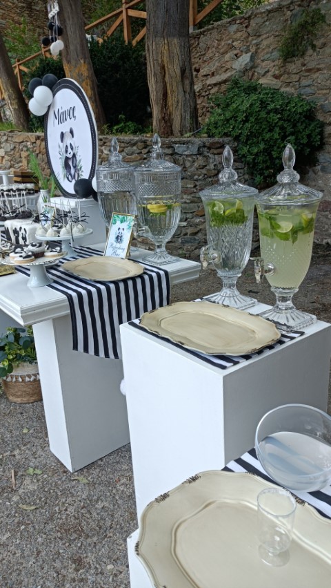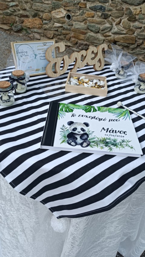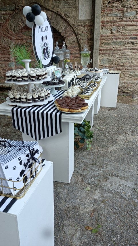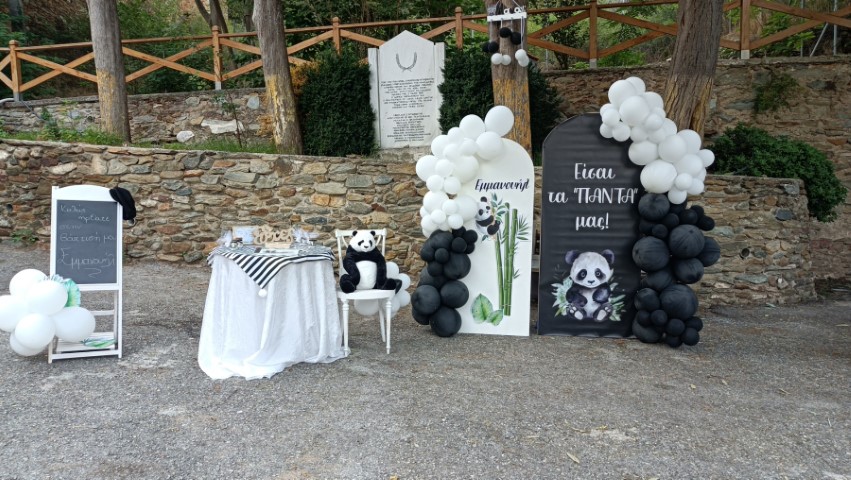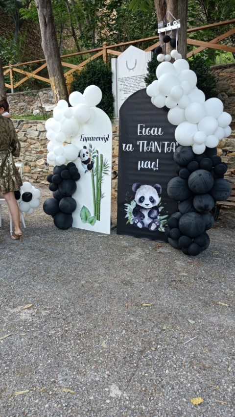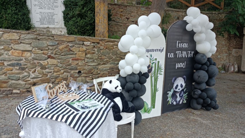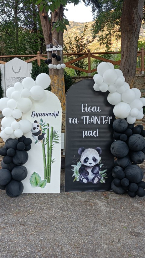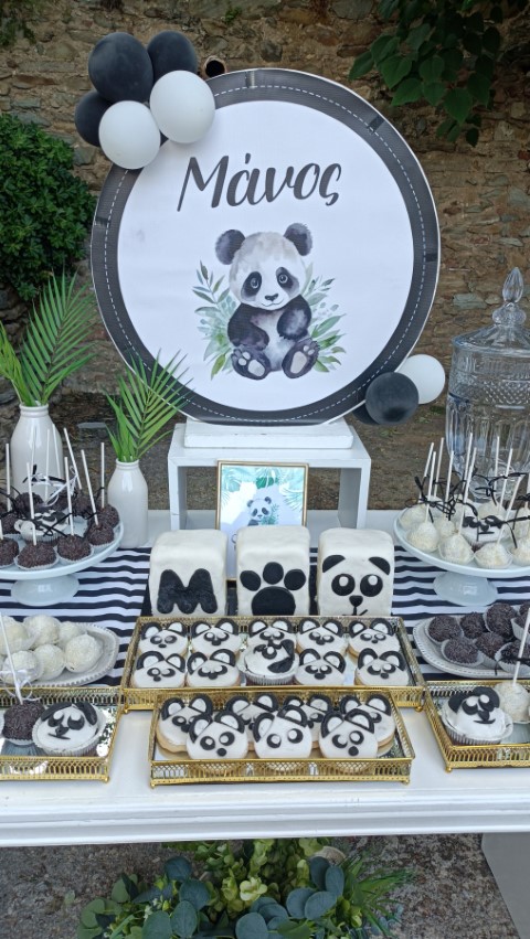 Στολισμός βάπτισης για αγοράκια, με θέμα το αρκουδάκι panda. Εντυπωσιακό dessert table σε ασπρόμαυρες αποχρώσεις, φιγούρες panda, καλάθια με συνθέσεις ευκάλυπτου, μπαμπού και μονστέρας, μπαλονάκια στα εντυπωσιακά backdrops και πολλές άλλες λεπτομέρειες διακόσμησης που έκλεψαν τις εντυπώσεις. Ένα όμορφο σκηνικό με υπέροχες γλυκές λιχουδιές , θεματικές μπομπονιέρες και παιδικά δωράκια, που ευχαρίστησε μικρούς και μεγάλους!
