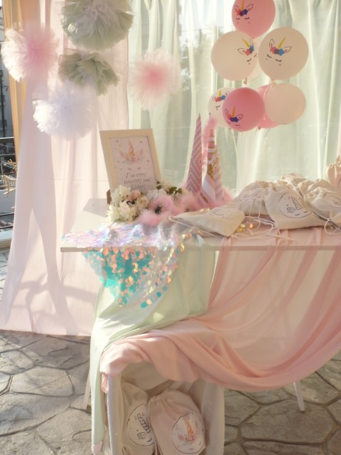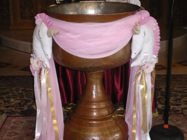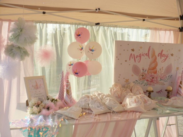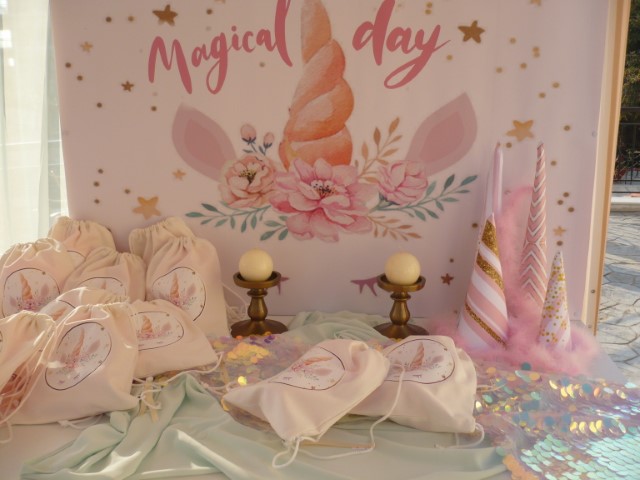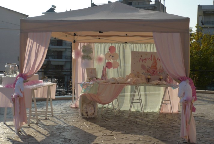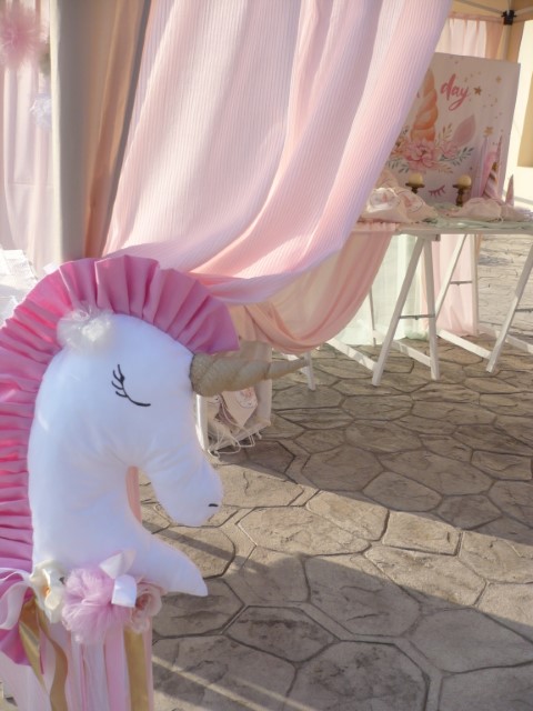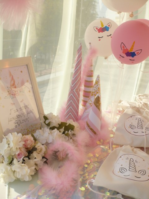 Μία υπέροχη βάπτιση βγαλμένη από παραμύθι με θέμα τον μονόκερο. Κυρίαρχο χρώμα το ροζ με χρυσές πινελιές που δίνουν ένα ξεχωριστό αποτέλεσμα. Μπαλόνια, πρωτότυποι διακοσμητικοί κώνοι, μαραμπού φτερά, κηροπήγια και πομ πομ δημιουργούν μία παραμυθένια ατμόσφαιρα που κερδίζει τις εντυπώσεις.