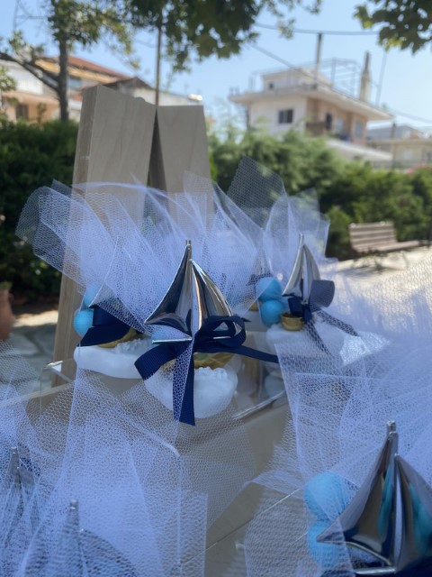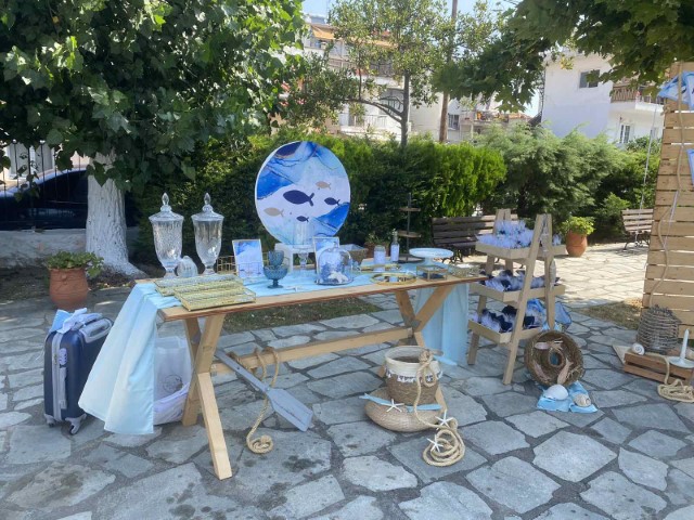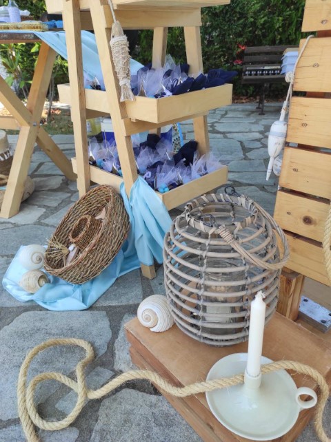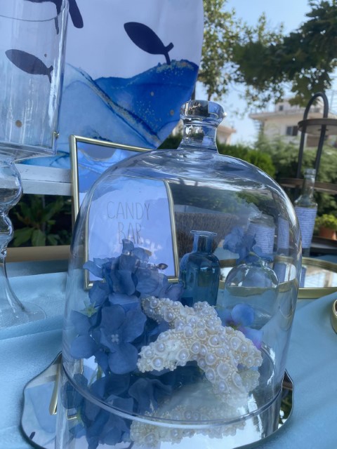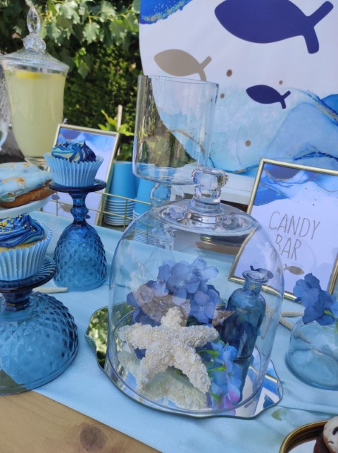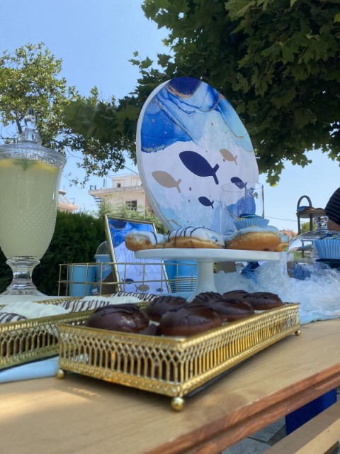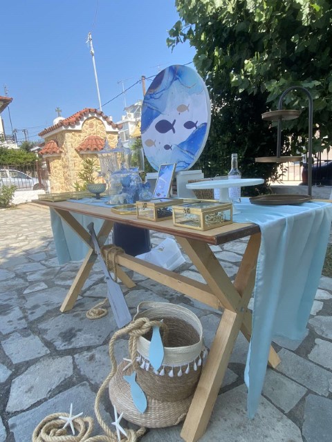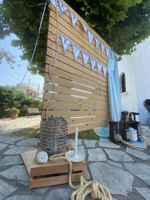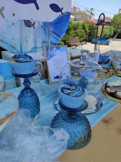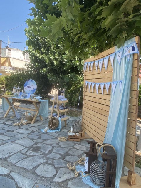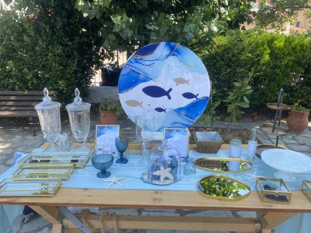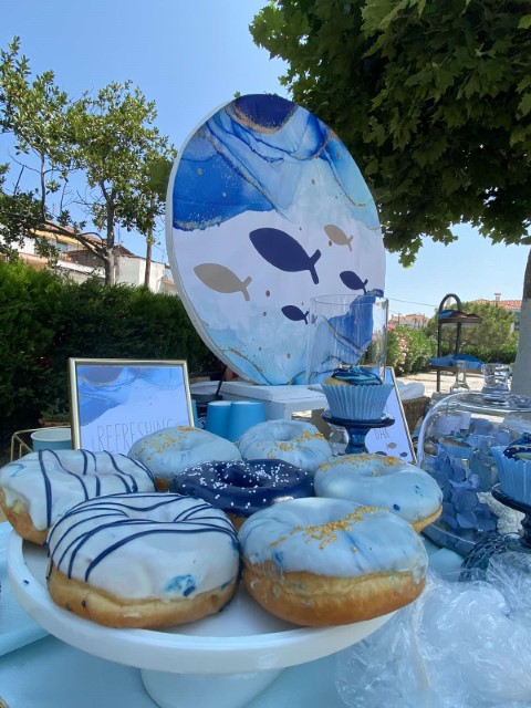 Εντυπωσιακό ξύλινο dessert table με κεντρικό στοιχείο θαλασσινό γραφιστικό σε αποχρώσεις του μπλε. Γλυκά και διακοσμητικά συνδυασμένα αρμονικά με το θέμα και backdrop, διακοσμημενο με θαλασσινά στοιχεία, όπου φωτογραφήθηκαν όλοι οι καλεσμένοι με το νεοφώτιστο. Το θαλασσινό θέμα θα δώσει μια νότα δροσιάς και καλοκαιριού στην βάπτιση του παιδιού σας.