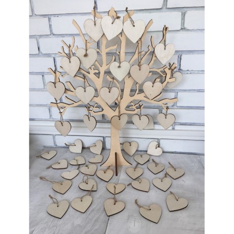 Ξύλινο δεντράκι ευχών από φυσικό ξύλο για να κρεμάσουν οι καλεσμένοι σας τις καρδούλες που θα γράψουν πάνω τις ευχές τους. Στην συσκευασία περιλαμβάνονται 50 καρδιές ύψους 6εκ. Διαστάσεις: Ύψος 50εκ. x μήκος 40εκ.