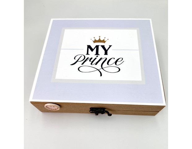 Ξύλινο κουτί για μαρτυρικά με θέμα my prince. Διαστάσεις: ύψος 22 x μήκος 20 x πλάτος 5,5εκ.