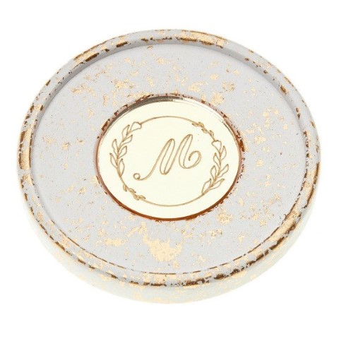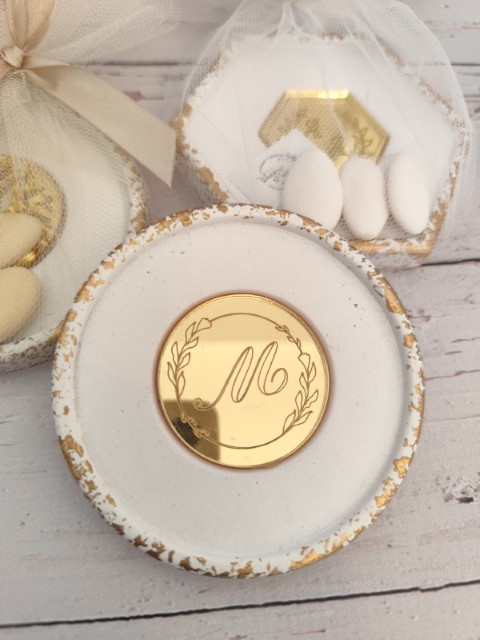 Μπομπονιέρα κεραμικό σουβέρ με plexiglass στο κέντρο και χαραγμένα μονογράμματα. Διάμετρος 10 εκ.