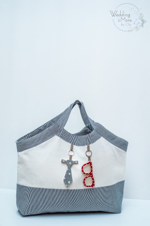 Χειροποίητη τσάντα βάπτισης από λεύκο βαμβακερό τζιν ύφασμα με ριγέ λεπτομέριες και ξύλινα μπρελόκ σε σχήμα γυαλιών και γραβάτας. Συνδυάζεται με την αντίστοιχη λαμπάδα, λαδόπανο και μπομπονιέρα. Ιδανική για καθημερινή χρήση πέραν της βάπτισης.